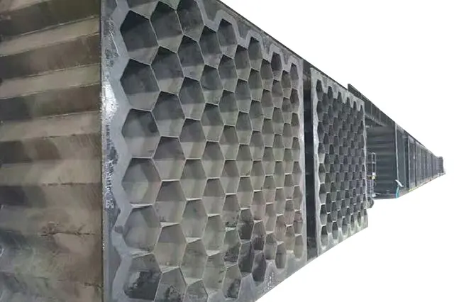 用于湿式电除尘(雾)器的导电玻璃钢阳极管多为正六边形规格,管内切圆直径250mm~400mm,管长可达6米,管壁厚约3mm。阳极管模块由若干根正六边形管组合在一起组成沉淀极。